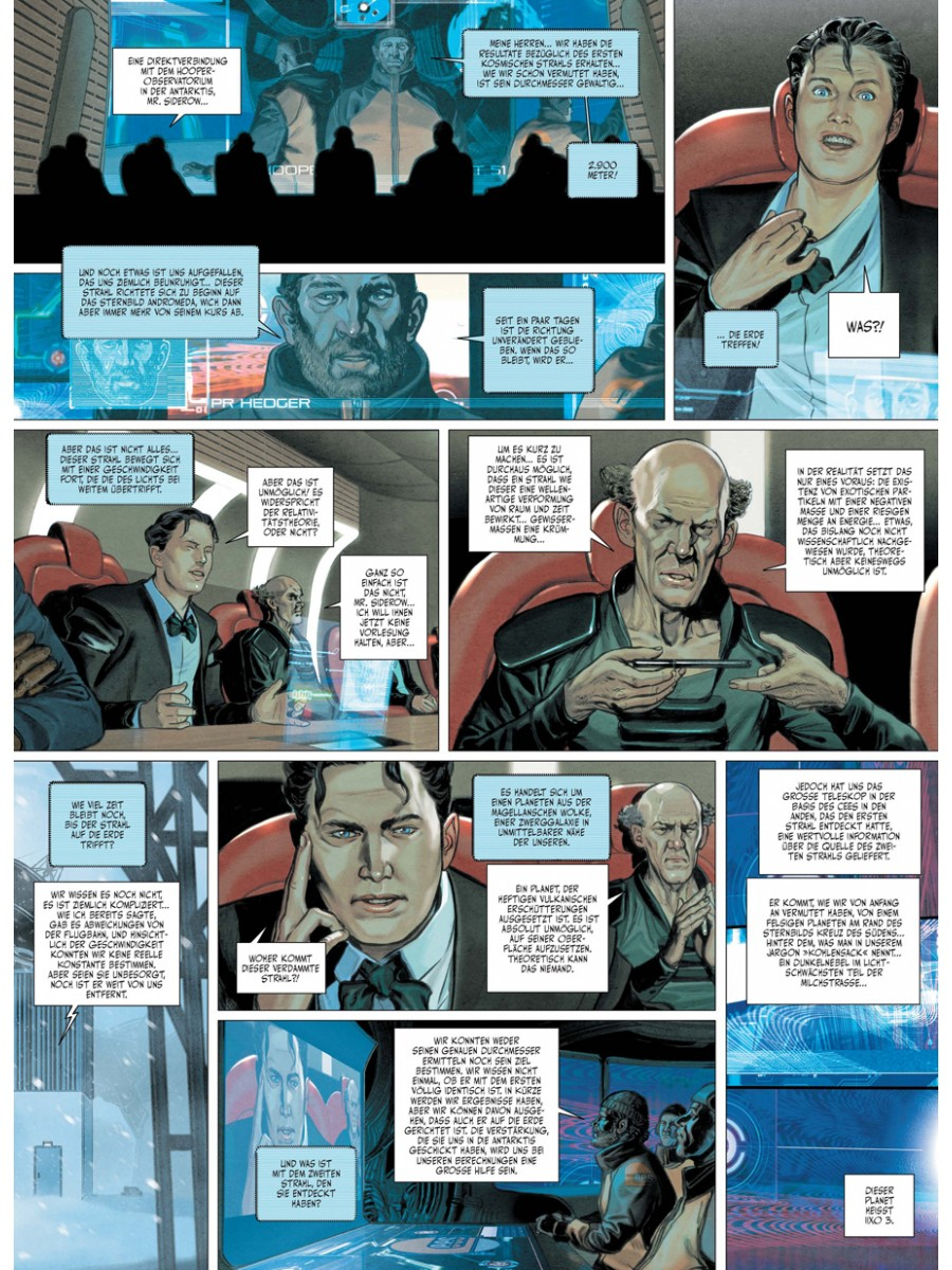 Christophe Bec (u. a. »Prometheus«, »Siberia 56«) und Zeichner Jaouen haben sich ganz bewusst entschieden, ein beliebtes, geradezu klassisches Motiv des SF-Kinos der 70er-/80er-Jahre wiederaufzugreifen, von »2001« bis »Alien«: die unerwartete Konfrontation mit einer extraterrestrischen Existenz, letztlich eine Begegnung der unverstandenen Art. Jaouen verwendet dafür denn auch in Blau, Grün und Dunkelheit getauchte Bilder von nüchterner Schönheit, die beides verkörpern, Faszination wie Erschrecken angesichts der unfassbaren Dimensionen im All. Aber deshalb innehalten, aufgeben oder gar zurückweichen? Niemals...