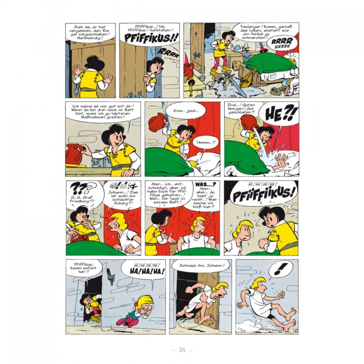 Erste Auftritte von Johann, dem (damals noch blonden) Pagen des Königs, fanden schon ab 1947 in den belgischen Tageszeitungen »La Dernière Heure« und später »Le Soir« statt. Ab 1952 erlebte er dann, nunmehr schwarzhaarig, seine ritterlichen Abenteuer Woche für Woche im renommierten Comic-Magazin »Spirou«. Mit dabei sind zudem schon bald sein quirliger Gefährte Pfiffikus sowie dessen charakterstarke schwarze Ziege Ricki, und zusammen lernen sie viele interessante Gestalten kennen, wie etwa den Zauberer Homnibus und seinen Gehilfen Oliver… aber auch im »verwunschenen Land« die kleinen blauen Wichte, die so schlumpfig aussehen, sich so schlumpfig bewegen und in ihrer eigenen Schlumpfsprache sprechen. Johann, Pfiffikus und die Schlümpfe werden schnell Freunde und kämpfen von nun an immer wieder gemeinsam gegen Schurken und stehen stets ein für das Gute...