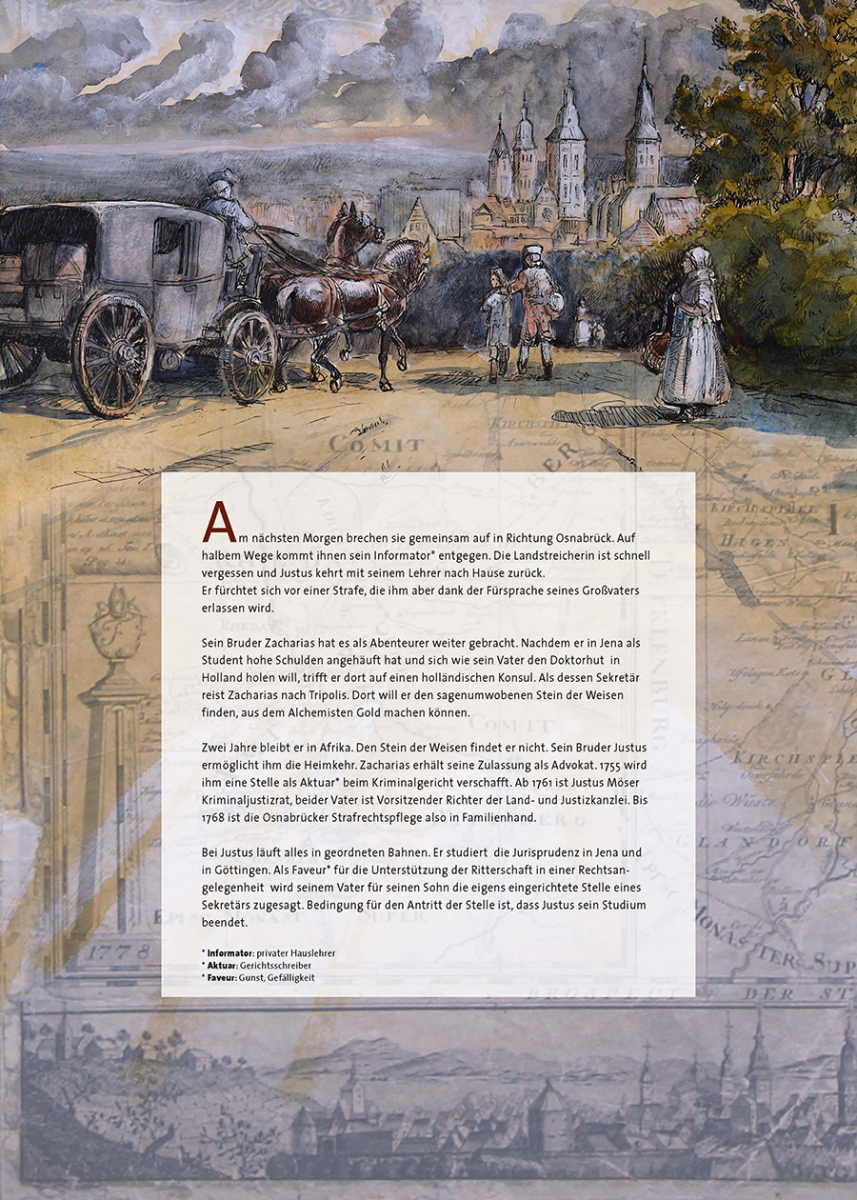 Der bedeutende Osnabrücker Jurist, Literat und Staatsmann Justus Möser (1720–1794) gilt als Aufklärer in der Ständegesellschaft. Seine historische Bedeutung ist verbunden mit dem Prozess der Veränderungen seiner Zeit, als sich der fürstliche Obrigkeitsstaat in einen bürgerlichen Rechtsstaat zu wandeln beginnt. »Möser – die Graphic Novel« beleuchtet am Beispiel des Osnabrückers das Zeitalter der Aufklärung. Die Epoche sorgte für wichtige gesellschaftliche Veränderungen, die bis in die Gegenwart von zentralem gesellschaftlichem Einfluss sind. Zu denken ist an die Ausbildung der individuellen Freiheit als zentrales Menschenrecht, die Relevanz von autonomer Vernunft und Kritikfähigkeit. Die Ideen der Aufklärung sind heute wieder absolut aktuell. Um es mit Kant zu sagen: »Wage zu wissen! Befreie dich aus deiner selbstverschuldeten Unwissenheit.« Möser war Teil dieser progessiven Zeit an der Wende zur Moderne. Dabei blieb ihm das historisch Gewachsene wichtig.