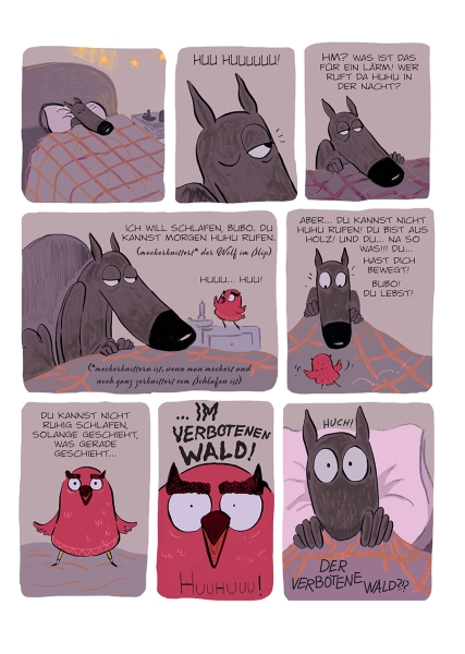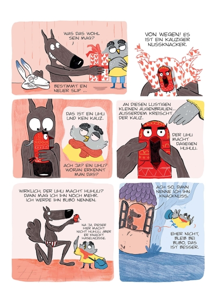 Im Wald wird es winterlich, und alle sind mit Einkaufen, Packen und Backen beschäftigt, denn zu Weihnachten wird die Haselnuss gefeiert! Zeit für Frau Eule, ihre alljährliche Geschenke-Tour zu machen. Der Wolf erhält eine wunderschöne, knallrote Nussknacker-Eule – was für ein tolles Geschenk! An diesem Abend geht der Wolf überglücklich ins Bett. Doch mitten in der Nacht wird er von seltsamen Geräuschen geweckt. Seine Eule ist zum Leben erwacht! Ist das ein Traum? Ist das ein Albtraum? So oder so führt die geheimnisvolle Eule den Wolf tief in den verbotenen Teil des Waldes, wo furchtbare Schrecken warten... und wir alle wissen: Auch Wölfe können Angsthasen sein!